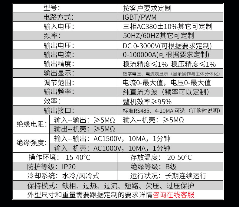 | 型号 | 输出电泳A | 输出电压V | 功率KW | 输入电流A | 输入电压V | 重量KG | 宽W*长L*高H |