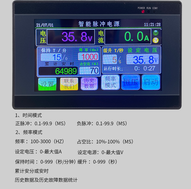 2.The touch screen human-machine interface has functions such as voltage or current setting,frequency setting,duty cycle setting and mult-time setting.